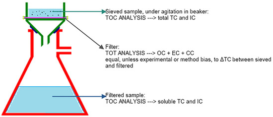 The work scheme set up and followed in this work (as represented in Figure 4) involved melting the solid samples without portioning them (no pre-treatment needed), an initial sieving necessary for TOC analysis, and filtration through a quartz filter, which was analyzed using TOT (the operations of melting, sieving, and filtration are described further in the following paragraphs).