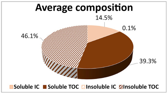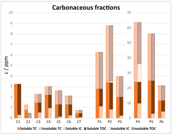 These conclusions further emphasize the importance of the complementarity of the two analytical techniques (TOC analysis and TOT). The main example was sample P4, in which the contamination due to carbonates could explain both the unusually high presence of EC and the large difference in the results of the two techniques for this sample, as both OC and EC could have been overestimated because of the presence of insoluble IC.