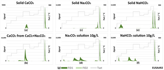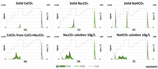 Regarding TOT, being the different components operationally defined carbonaceous fraction, the results are strictly dependent on the temperature protocol used. In the case of CC, also taking into consideration the chemical nature of the species, these will evolve at different points during analysis. The only one that evolved, as expected, in the OC4 fraction was anhydrous calcium carbonate. However, this may not be the only species evolving in this time frame, as peaks were also observed for samples in which insoluble IC was not detected via TOC analysis. Changing the state of the substances (solid vs. solution) had a significant impact on the results, as the carbonate–bicarbonate equilibrium is established in solution. For these reasons, in the analysis of snow samples that have melted, carbonate carbon should be eliminated a priori by exposure to gaseous HCl [38].