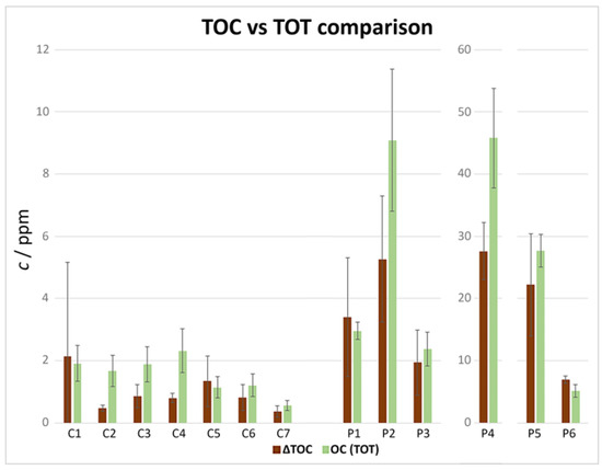 The results obtained with the two techniques were in agreement, suggesting the accuracy of the measurements. When the confidence intervals were not overlapping, the TOT (OC) measurements were slightly higher. Greater differences were observed for sample P4 and should be studied on a dataset with a higher number of replicates to lower the uncertainty, as well as improve the calibration, not in terms of range, but in terms of replicates over time.