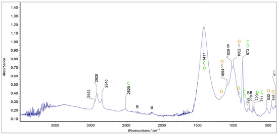 The typical peaks of calcite were also present [42]. The weak band at 729 cm−1 indicated the presence of the mineral dolomite, chemically a carbonate of calcium and magnesium [43]. The bands at about 1420 and 873 cm−1 were also common to calcite and dolomite. Instead, the peaks at 532 and 464 cm−1 [37], together with the small shoulder present at 913 cm−1, were ascribed to the presence of ochre, a mixture of iron oxides. The shoulders at 1110 and 1165 cm−1 could also be ascribable to the presence of ochre. The very broad peak present at around 3300 cm−1 was due to the stretching of the hydroxyl group, probably due to the presence of liquid water, even if the contribution of hydration molecules, rather than an alcohol or carbohydrate component, could not be distinguished, given the presence of the peaks at about 2900 cm−1, corresponding to the symmetric and asymmetric stretching of -CH groups.