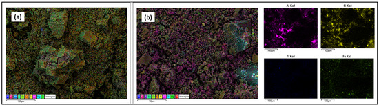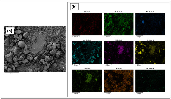 From the maps, it can be observed that the larger particles mainly consisted of silicates, due to the co-presence of silicon, oxygen, aluminum, sodium, potassium, calcium, and magnesium in the same area.