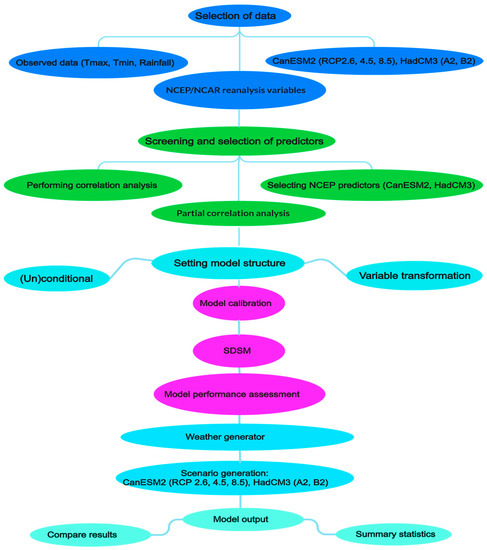 The SDSM downscaling procedure includes the following steps: screening of predictor variables; model calibration; weather generation and generation of synthetic daily weather data; future ensemble data generation using predictor variables from the GCM; and summary statistics and results comparison for both observed and downscaled data [95,97]. Screening for significant predictors is an important step in statistical downscaling for model calibration in the SDSM [94]. Statistical methods are used to choose predictors, and at least two predictors are enough during the screening process [98].