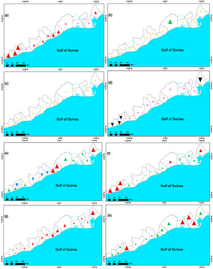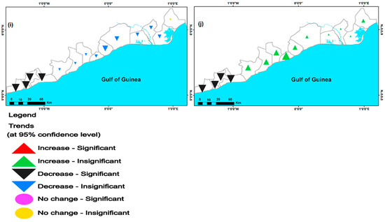 Table 6 and Figure 4a–j show the long-term changes in extreme rainfall indices and the spatial distribution of the trends in rainfall for the coastal Savannah agroecological zone of Ghana. From Table 6, the maximum 1-day precipitation amount (RX1day) significantly decreased in Cape Coast, Elmina, Moree, and Saltpond. A similar and significant decrease, including in the central region, is observed in the maximum 5-day precipitation amount (RX5day). The simple precipitation index (SDII) significantly decreased in Cape Coast, Elmina, Moree, and Saltpond. The number of days of heavy precipitation (R10) also decreased significantly in Cape Coast, Elmina, Moree, and Saltpond. From Figure 4a–d, the magnitudes of changes in RX1day, RX5day, SDII, and R10 are greater in some areas of the central region than in the other two. The number of consecutive dry days (CDD) decreased significantly in Accra, Ada Foah, Anloga, Denu, Keta, Prampram, the Greater Accra and Volta regions, and the entire zone. That is, the Greater Accra and the Volta regions recorded more dry days than the central region (Figure 4f). The annual sum of very wet days (R95p) significantly decreased in Cape Coast, Elmina, Moree, Saltpond, and the central region. As shown in Figure 4h, the R95p in the central region is significantly lower than in the other two regions. A similar trend is observed in the annual sum of extremely wet days (R99p) (Figure 4i). From Table 6, both increasing and decreasing trends are observed for the consecutive wet days (CWD) and the annual total of wet-day precipitation (PRCPTOT). However, the trends were insignificant. This is also evident in Figure 4g,j.