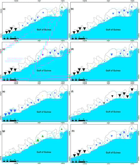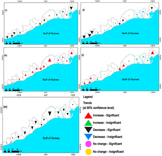 The monthly or annual maximum of daily maximum temperature (TXx) (Figure 3e) significantly increased only for Accra, Denu, and Tema, whereas the monthly or annual maximum of daily minimum temperature (TNx) (Figure 3f) increased for Cape Coast, Denu, Elmina, Moree, Prampram, the central region, Volta region, and the entire zone. The monthly or annual minimum daily temperature (TNn) significantly increased in Ada Foah, Anloga, Keta, Saltpond, and the entire zone. Figure 3h reveals that the magnitude of change in TNn is higher in the Volta region and some areas of the central region than in the Greater Accra region. Moreover, the proportion of cool days (TX10p) significantly decreased for Accra, Cape Coast, Denu, Elmina, Moree, and Tema, and for the central and Volta regions and the entire zone, whereas the number of warm days (TX90p) significantly increased for Accra, Cape Coast, Denu, Elmina, Moree, and Tema, and the Greater Accra region. From Figure 3j, the decrease in TX10p is higher in the central region compared to that in the other two regions, while the magnitude of change in TX90p (Figure 3l) is higher in some portions of the Volta and Greater Accra regions.