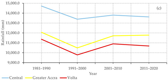 Figure 5c shows that rainfall exhibits decadal variations. Rainfall increased in the first and third decades across all three regions but decreased in the second and fourth decades, except for Greater Accra, where it increased in the fourth decade. Based on Welch’s t test in Table 7, the central region had a significant increase in rainfall between the first and second decades. Between the second and third decades, the central region experienced a significant increase, while the Greater Accra and Volta regions observed significant decreases.