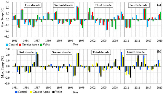 Generally, the anomalies in Tmax and Tmin show a stronger seasonal decadal variation across the zone (Figure 6a–f). Between 1981 and 2020, the highest positive (2.3) and negative (−1.8) dry season anomalies for Tmax (Figure 6a) both occurred in the central region in the years of 1998 (the second decade) and 2006 (the third decade), respectively. In Figure 6b, the greatest positive (2.5) and negative (−1.9) wet season anomalies appeared in the central region and the Volta regions in 1987/2010 (both the first and third decades) and 2012 (the fourth decade), respectively. For the minor season (Figure 6c), the highest positive (2.3) occurred in the central region in 2013 (the fourth decade), while the highest negative (−1.9) ensued in the same region and the Greater Accra region in 2007 (the third decade).