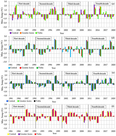 From Figure 6d, the greatest positive (2.3) and negative (−1.9) anomalies for the dry season Tmin occurred in the central and Volta regions in 1998 (the second decade) and 2008 (the third decade), respectively. For the wet season (Figure 6e), the greatest positive (2.1) ensued in both the central and Greater Accra regions in 1987/2010 (both the first and third decades), while the greatest negative (−1.8) appeared in the central and Volta regions in 2004 (the third decade). In Figure 6f, the highest positive (1.9) and negative (−1.9) anomalies for Tmin were both recorded in the Volta region in the years 1997 (second decade) and 2002 (third decade), respectively.