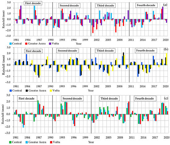 Standardized anomalies for mean decadal rainfall for 1981–2021 for dry season (a), wet season (b), and minor season (c).