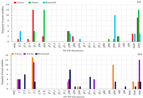 Screened variables of the NCEP predictors for CanESM2 (a) and HadCM3 (b) for Tmax, Tmin, and rainfall for all areas (central, Greater Accra, Volta, and the entire zone).