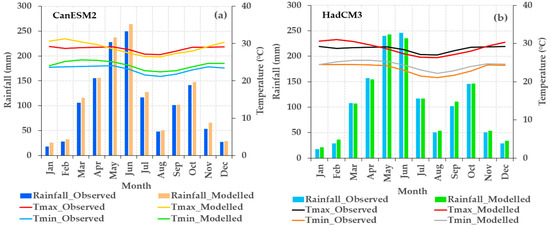 The study used calibration periods of 30 (1981–2010) and 26 (1981–2006) years and validation periods of 11 (2011–2021) and 15 (2007–2021) years for CanESM2 and HadCM3, respectively. The statistical performance regarding the coefficient of determination (R2), the root mean square error (RMSE), and the percent bias (PBIAS) of the model is also presented in Table 8. The CanESM2 and HadCM3 models’ performances were good and ranged from 58–99%, 0.01–1.02 °C, and 0.42–11.79 °C, respectively, for R2, RMSE, and PBIAS (for all three regions and the entire zone) (Table 8). The performance of CanESM2 ranged from 76–99%, 0.01–1.02 °C, and 0.22–10.01 °C for R2, RMSE, and PBIAS, respectively. The performance of the HadCM3 also ranged from 58–99%, 0.02-0.91 °C, and 0.42–11.79 °C for R2, RMSE, and PBIAS, in that order.