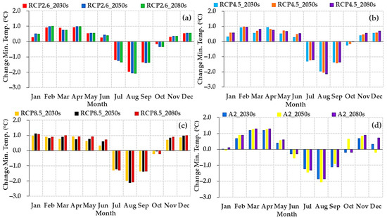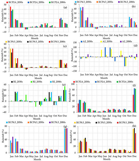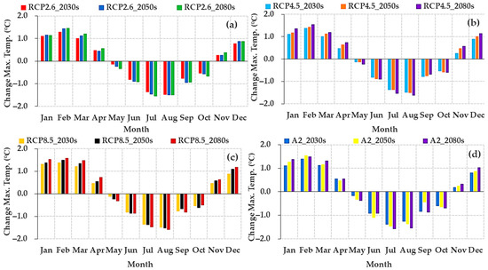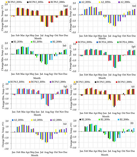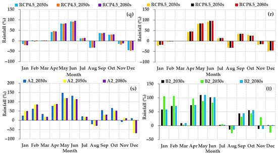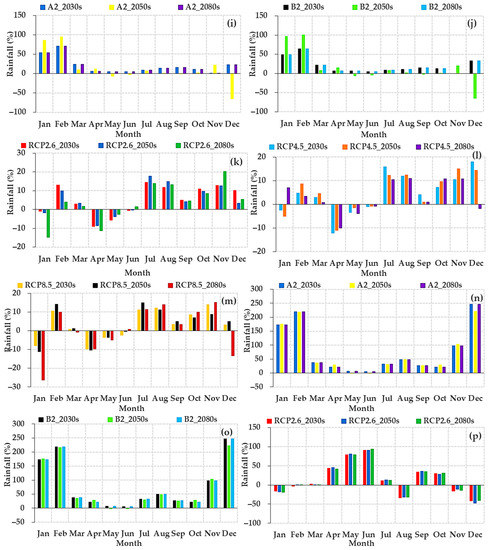 Wilby et al. [94] created the SDSM by combining stochastic weather generators with multiple linear regression to construct local weather variables based on the statistical relationship between large-scale predictors and local climate variables. Regression-based downscaling is an established and often employed methodology [95]. The SDSM can downscale GCM outputs by establishing a statistical link between GCM variables (predictors) and local weather variables (predictands) using multiple linear regression models and stochastic bias-correction approaches [96]. To generate the daily local Tmax, Tmin, and rainfall using the SDSM, we used the CanESM2 acquired from the Canadian Center for Climate Modeling and Analysis as CMIP5 and the HadCM3 from the United Kingdom Hadley Centre as CMIP3, in addition to the NCEP data. Synthetic weather data were made using the CanESM2 RCP2.6, RCP4.5, and RCP8.5 scenarios from 2011–2100 and the HadCM3 A2 and B2 scenarios from 2007–2099.