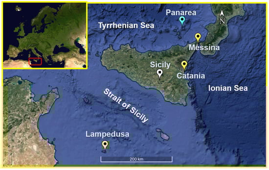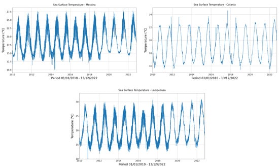 The Mediterranean Sea is a geographic area that is particularly affected by Global Warming [,,,]. Despite negative temperature anomalies were observed in the Northern Atlantic Ocean (e.g., Cold Blob), in the last few years, positive anomalies in the Mediterranean area were recorded [,,]. In this regard, with the aim to show the upward trend of the sea surface temperature in the Mediterranean Sea [,], the marine climate data, recorded by the Rete Mareografica Nazionale (RMN), belonging to the Istituto Superiore per la Protezione e la Ricerca Ambientale (ISPRA) (available at https://www.mareografico.it/ (accessed on 13 December 2022)), were analyzed. The RMN is composed of 36 stations, evenly distributed in the Italian territory, mainly placed inside portual areas. In particular, three measuring stations (see Figure 1), two of these placed in eastern Sicily (Messina and Catania cities), and the other one placed in Lampedusa Island, which, in relation to its geographical position, represents a natural hotspot on the Mediterranean Sea for Climate Change studies, were selected.
