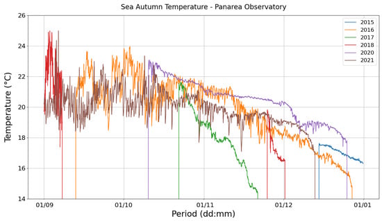 In addition, in order to highlight that the positive thermal anomaly recorded in the Mediterranean Sea does not concern only surface temperatures, data acquired by a multidisciplinary submarine observatory, starting from the end of 2015, were analyzed. This research infrastructure, managed by the Istituto Nazionale di Geofisica e Vulcanologia (INGV) of Palermo (Italy), is located about 2 miles east of Panarea Island (Aeolian Archipelago, Southeastern Tyrrhenian Sea, see Figure 1) and consists in a pole beacon connected to a seafloor observatory located at depth of about 23 m [,]. The analysis focused on the autumn period and the result obtained shows an increase in the trend of thermal values, especially during November and December (see Figure 3).