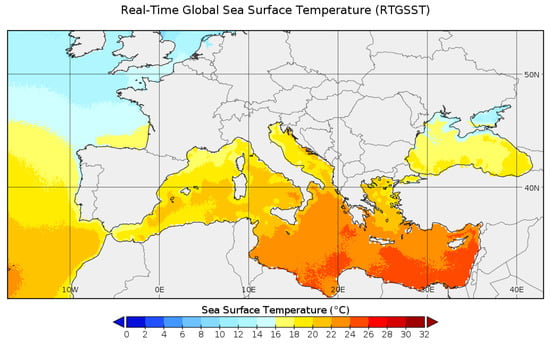 The data acquired from the Global Forecast System (GFS) with a resolution of 0.25 degrees (available at https://soostrc.comet.ucar.edu/data/grib/gfsp25/20191111/ (accessed on 5 September 2022)) provided the initial and boundary conditions. We have used data with a time resolution equal to one hour, processed starting from the 00:00 UTC run, relative to 11 November 2019, thus providing a sufficient spin-up time [,,]. The performed simulation ended at 00:00 UTC of 13 November 2019, for a total duration of 48 h. Furthermore, the Real-Time Global Sea Surface Temperature Analysis (RTG-SST), with a resolution equal to 0.083 degrees (available via ftp at: ftp://ftp.ncep.noaa.gov/pub/data/nccf/com/gfs/prod (accessed on 5 September 2022)) was used. Values of RTG-SST for 11 November 2019 are shown in Figure 4. In particular, between the coasts of eastern Sicily and north Africa, the SST had values of around 24 °C, with maximum peaks close to 26 °C.