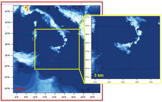 The nesting protocol [,], with One-Way configuration [,], was adopted. With the use of this technique, it was possible to obtain a nested domain, with a finer spatial grid and, consequently, an increased spatial resolution with respect to the parent domain. The two different employed domains, with the respective resulting orography, are reported in Figure 5. In particular, starting from a parent domain with a resolution of 9 km (left in Figure 5), a nested domain (right in Figure 5) with a resolution of 3 km (ratio 1/3) was obtained.
