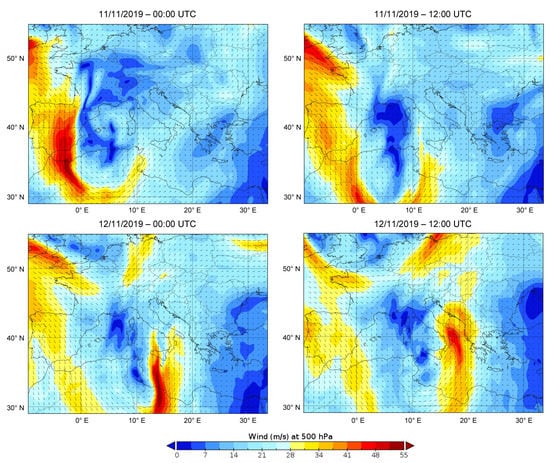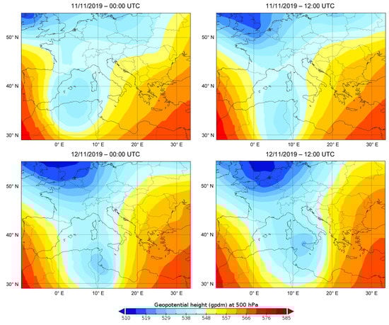 In particular, the maps of geopotential height at 500 hPa (Figure 6) show the presence of a cyclonic vortex, which, at 00:00 UTC on 11 November 2019, was positioned between Spain, Sardinia, and the northern African coasts (top left in Figure 6). In the following hours, with a classic zonal circulation, the cyclonic vortex reached Sicily (top right and bottom panels in Figure 6).