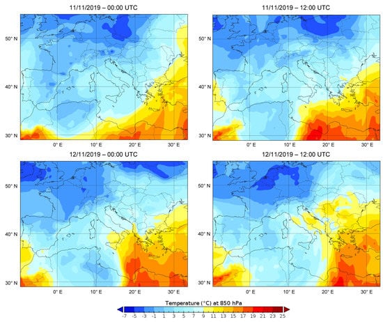 Temperature (°C) at 850 hPa at 00:00 UTC, 12:00 UTC of 11 November 2019 and 00:00 UTC, 12:00 UTC of 12 November 2019.