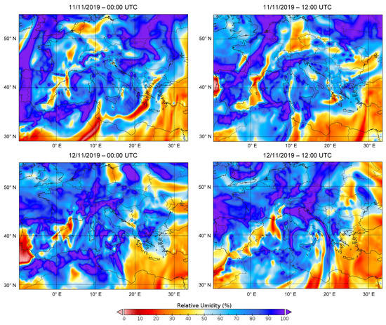 Relative humidity (%) at 850 hPa at 00:00 UTC, 12:00 UTC of 11 November 2019 and 00:00 UTC, 12:00 UTC of 12 November 2019.