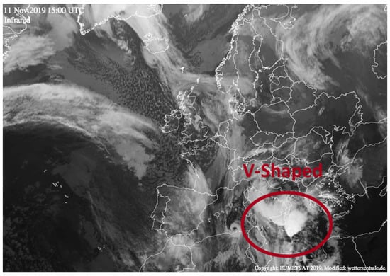 Infrared satellite image at 15:00 UTC of 11 November 2019, in which the genesis of a V-shaped storm is shown. Image used for permission by ©EUMETSAT, Modified: wetterzentrale.de available online https://www.wetterzentrale.de/reanalysis.php-jaar=2019&maand=11&dag=11&uur=1500&var=44&map=1&model=sat (accessed on 11 November 2019).