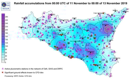 In this framework, with the aim to study one of these meteorological events, we analyzed an event recorded on November 2019. In particular, from the meteorological point of view, Sicily was affected by three relevant events on the dates: 11–12, 16–17, and 23–24 November. Among these days, the most severe weather event was recorded on 11 and 12 November, which affected, in particular, the eastern sector of Sicily, where intense rainfall accumulations were observed (maximum rainfall accumulation recorded by the Linguaglossa North Etna meteorological station equal to 293.6 mm at the end of the event).
