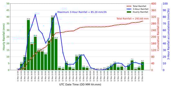 The Linguaglossa North Etna meteorological station recorded the maximum rainfall peak, equal to 293.6 mm. In Figure 12, the hourly precipitation (green bars), the total rainfall accumulations (red line) and the maximum precipitation every three hours (blue line), are shown. In particular, it can be noted that the most intense rainfall accumulations were recorded between 13:00 UTC and 23:00 UTC on 11 November 2019.