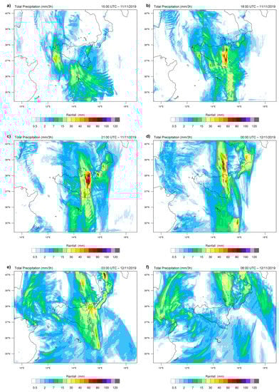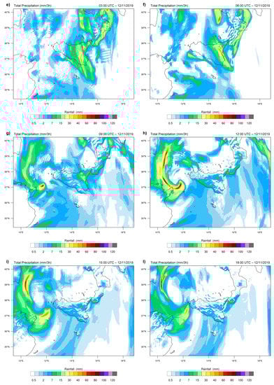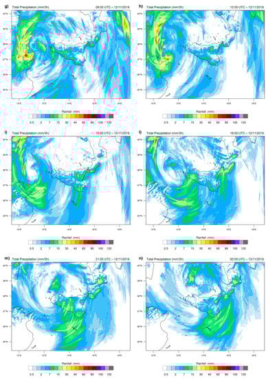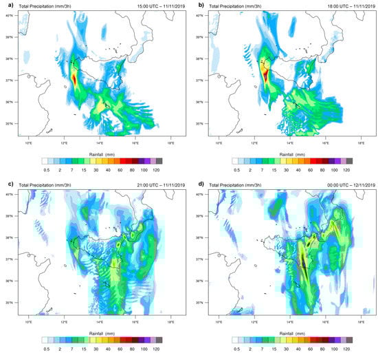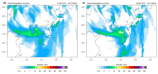 In this case, the rainfall accumulations forecasted, during the afternoon, affected only the western and eastern sectors of Sicily (panels a) and b)). In the evening, precipitations were expected in much of the regional territory. However, the most intense phenomena were expected in the eastern sector of Sicily, particularly close to the Etna area and the Iblei Mounts, in the intervals 18:00–21:00 UTC and 21:00–00:00 UTC (panels c) and d)), in which the simulation forecasted rainfall accumulations close or higher than 100 mm/3 h. In the early hours (00:00–03:00 and 03:00–06:00 UTC) of 12 November 2019, rainfall accumulations close to 30–40 mm/3 h on the central and eastern sectors of Sicily were expected (panels e) and f)). In the following hours, the forecasted rainfalls were in attenuation and extension in most of the Sicilian regional territory (from panel g) to panel n)).