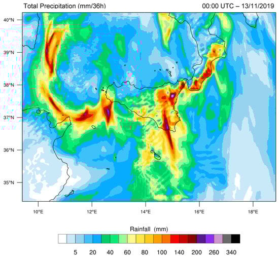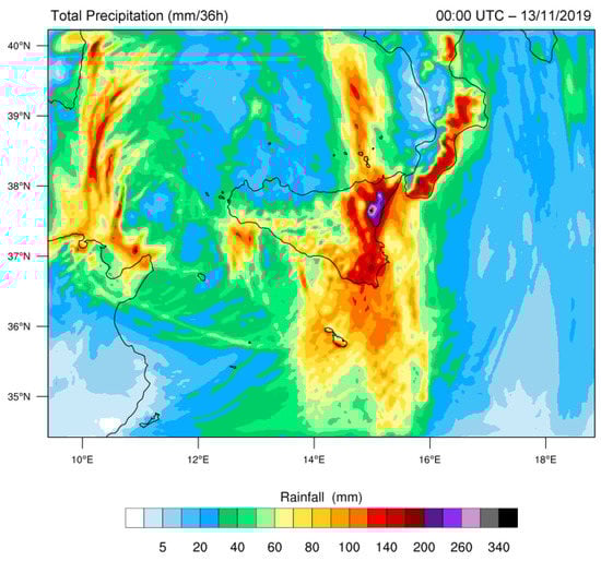 Figure 17 shows the rainfall accumulations map in 36 h. In this simulation, the highest rainfall accumulations were forecasted in the eastern sector of Sicily, particularly in the Etna area (with maximum peaks of about 300 mm/36 h) and in the provinces of Ragusa and Siracusa (with maximum peaks of about 220 mm/36 h).
