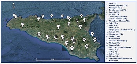 Moreover, in order to compare expected rainfall data with those observed in different areas of the Sicilian territory, the hourly rainfall accumulations in the geographical coordinates of 27 meteorological stations, belonging to the network of the Servizio Informativo Agrometeorologico Siciliano (SIAS), were extracted. These stations (geographical localisation shown in Figure 15) were chosen to take into account the features of the extreme weather event under consideration. In particular, the stations were placed: two in the province of Trapani (Erice, Trapani); three in the province of Palermo (Mezzojuso, Termini Imerese, Lascari); four in the province of Messina (Pettineo, Cesarò Vignazza, Caronia Pomiere, Montalbano Elicona); two in the province of Enna (Agira, Enna); four in the province of Catania (Bronte, Linguaglossa North Etna, Paternò, Mazzarrone); three in the province of Siracusa (Augusta, Siracusa, Palazzolo Acreide); four in the province of Ragusa (Modica, Comiso, Santa Croce Camerina, Acate); two in the province of Caltanissetta (Gela, Butera); and three in the province of Agrigento (Licata, Agrigento Mandrascava, Sciacca).