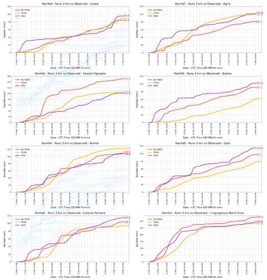 Considering the stations which observed rainfall accumulations close or higher to 100 mm/36, the simulations with FDDA forecasted total rainfall accumulations equal to: Licata (91.1), Agira (100.0 mm), Cesarò Vignazza (106.2 mm), Butera (62.3 mm), Bronte (123.0 mm), Gela (78.4 mm), Caronia Pomiere (93.9 mm) and Linguaglossa North Etna (283.5 mm).