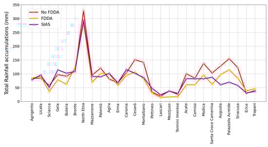 Furthermore, a comparison (see Figure 19) among the total rainfall accumulations observed from the 27 meteorological stations (purple line) and those forecasted from the two simulations (red line without FDDA and orange line with the FDDA technique) was carried out.