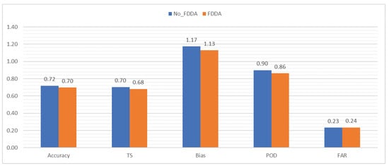 In Figure 20, values of dichotomous indices obtained, such as Accuracy, Threat Score (TS), BIAS, Probability Of Detection (POD), and False Alarms Rate (FAR), were reported.
