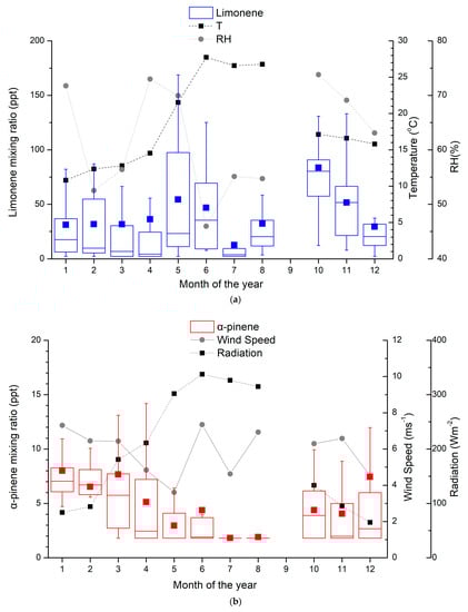 Monthly average mixing ratios (in ppt) of (a) limonene and (b) α-pinene at Finokalia station from March 2014 to April 2015. Whiskers represent the 5th and 95th percentiles, box edges are the 25th and 75th percentiles, the line in the box is the median, the square is the mean of the reported values, and the mixing ratio is in ppt. The meteorological parameters (temperature, relative humidity, wind speed and radiation), averaged over the days of the samplings, are also depicted.
