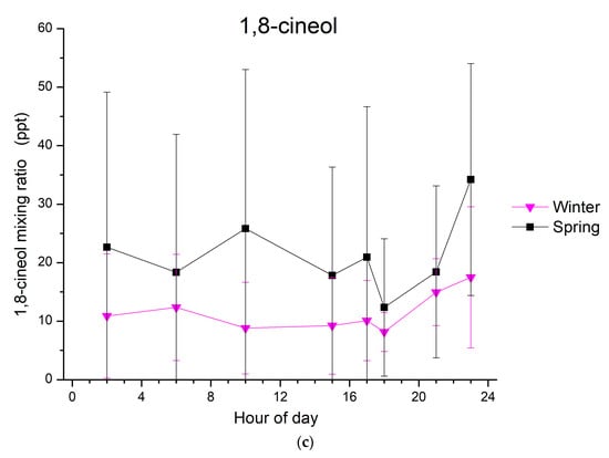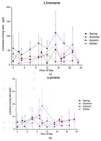 For α-pinene, different diurnal patterns to those of limonene are observed (Figure 2b). During autumn, a clear diurnal cycle was seen with two maxima, the first one in the early morning (6:00 to 7:00) and the second one around noon (~12:00). This is not the case for winter, when only one maximum can be seen in the morning (9:00 to 10:00). During both spring and summer, the α-pinene mixing ratios present a clear diurnal variability, with an early morning maximum followed by an early afternoon minimum, reflecting the daytime oxidation of this monoterpene. Concerning 1,8-cineol, the mixing ratios that were detected above the LOD and observed from January to March 2015 do not show any clear variability.