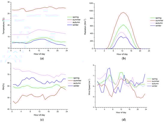 Diurnal variability of (a) temperature, (b) solar radiation, (c) relative humidity and (d) wind speed near surface averaged over the days of the observations during each season from March 2014 to April 2015.