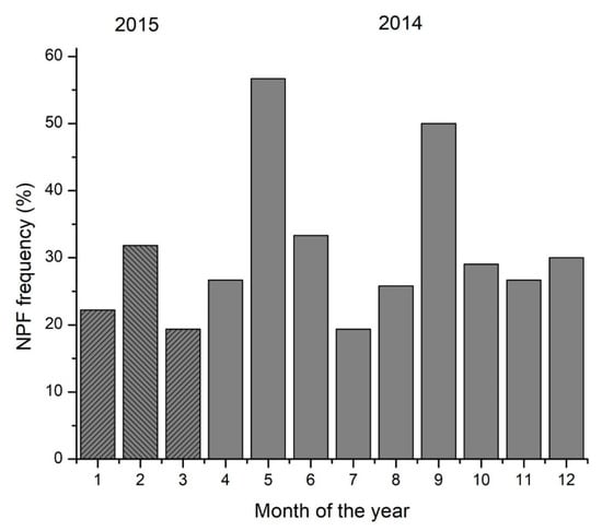 Monthly percentage frequency of occurrence of NPF at Finokalia station from March 2014 to March 2015 (full months are presented). Shaded columns indicate data from 2015.