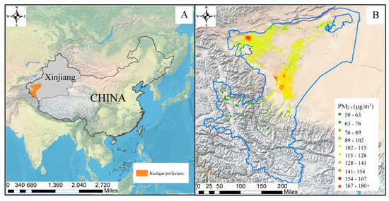 Map of China showing study location (A) and PM2.5 concentrations (B).