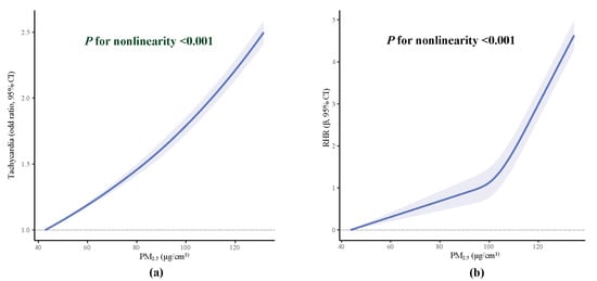 The tests of linearity showed that the association between PM2.5 levels and tachycardia prevalence was almost linear (Figure 2). We observed that higher PM2.5 levels were associated with higher RHR levels and a greater tachycardia prevalence. More specifically, in the adjusted models, an IQR increase in PM2.5 levels was associated with 0.515 (95% CI: 0.503–0.526) bpm increase in RHR levels and with 1.062-fold (95% CI: 1.059–1.064) increase in odds of tachycardia. When we categorized PM2.5 levels into quartiles, we found that, compared with the bottom quartile of PM2.5, those at the 2nd, 3rd, and 4th quartiles were associated with 1.079- (95% CI: 1.069–1.090), 1.207- (95% CI: 1.194–1.220), and 1.308- (95% CI: 1.292–1.323) fold increased odds of tachycardia, respectively, and with 0.140 (95%: 0.092–0.187) bpm, 1.349 (95% CI: 1.295–1.403) bpm, and 2.586 (95% CI: 2.528–2.644) bpm increases in RHR levels, respectively (Table 2). Similar effect estimates were observed in crude models (Table S1).