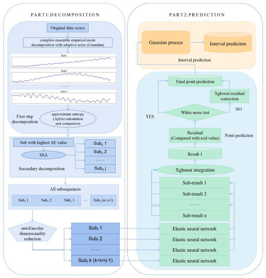 To solve the abovementioned problems, this study proposes a two-stage decomposition multi-scale nonlinear ensemble model with a Gaussian process. The original data series will firstly go through CEEMDAN, and the decomposed subsequence with the highest approximate entropy (AE) value will be decomposed again through singular-spectrum analysis (SSA) to fully separate signals with different characteristics. After secondary decomposition, there are too many subsequences to predict which one brings low efficiency and an error accumulation problem, so an auto encoder is employed for the dimensionality reduction. Next, because the elastic network has a fast convergence rate and always produces effective solutions, it is utilized to predict each subseries and all the results will be integrated by extreme gradient boosting (Xgboost). If the integrated predictive results pass through the white noise test, that means there is no more useful residual information. Conversely, if the white noise test is not positive, the errors will be input into Xgboost again to obtain corrected predictive results. The last step is the use of the Gaussian process (GP) in order to gain interval prediction results. The innovations of this paper are as follows: