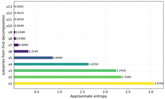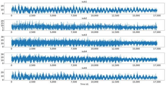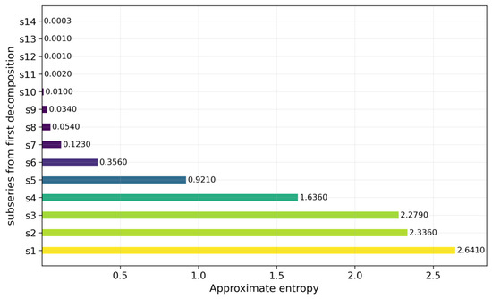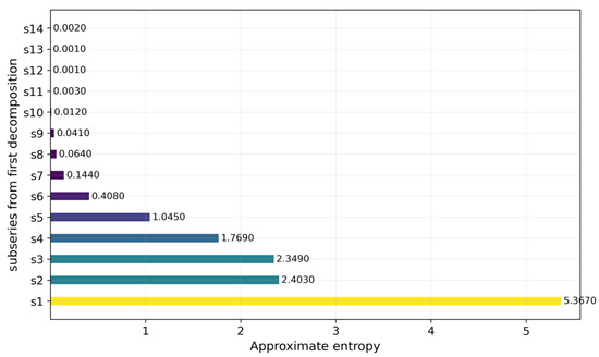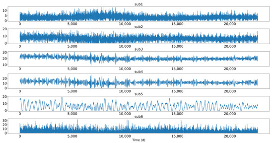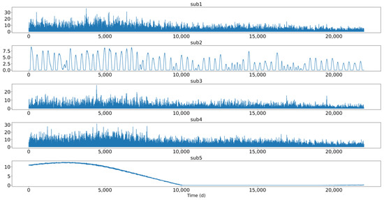 The highest value was over 2.5, which was decomposed again, separately, through SSA. Then, the auto encoder was applied to reconstruct the dimension and the output subsequences’ number was 5, which is shown in Figure 16.