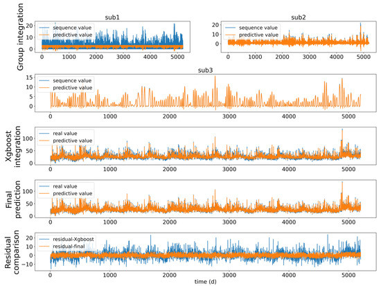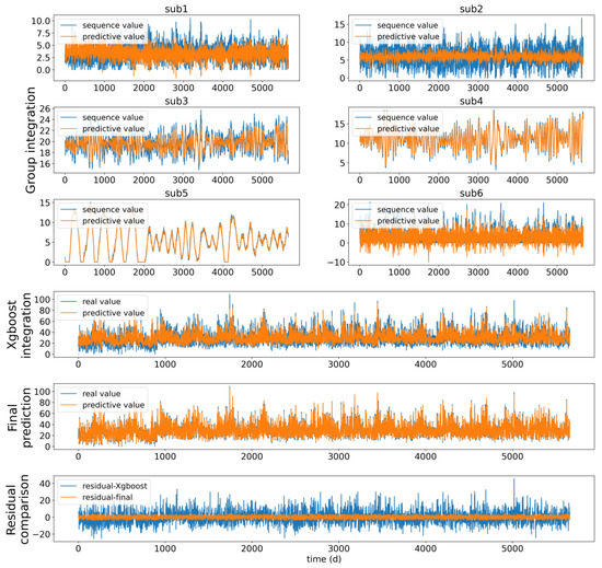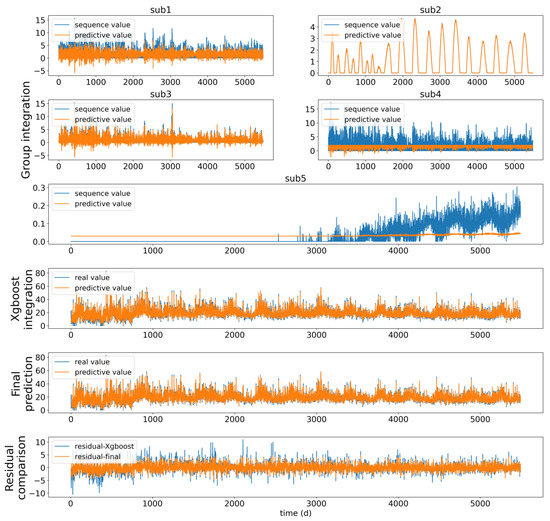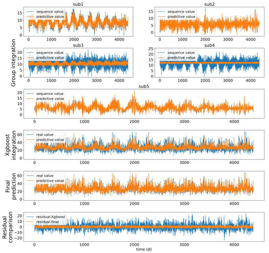 The first five subfigures are the point prediction results of subseries. The sixth subfigure titled “Xgboost integration” shows the integrated results. The seventh subfigure represents the final point prediction results which are generated based on the Xgboost integration and error correction strategy. The last subfigure is the residual comparison between the model with error correction strategy and the model without it. All the experimental results here used data in case 4.