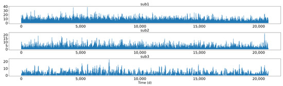 For the case of Jingtai, China, the original data series was firstly divided into subsequences using CEEMDAN. Then, for each subsequence, the AE value was calculated, as is shown in Figure 15.