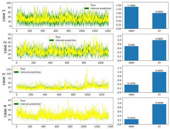 - Finally, as the residual correction strategy is another notable part in the proposed model, to further demonstrate the significance of this, the fifth model eliminated the residual correction process. Drawn from the table, the RMSE values of the four cases increased by 0.06, 0.04, 0.02, and 0.01, respectively, together with an increase in the MAE values in the first three cases, by 0.05, 0.04, and 0.02, respectively. While for the interval prediction, the CP values showed a great decline, and the gap narrowed further, with decreases of 1165.50 times, 535.38 times, 236.50 times, and 127.47 times in four cases. It has been said that MWP values cannot be too large or too small, and in this experiment, the MWP with too small values will turn the interval prediction to the results that are quite alike with the point prediction. In other words, the residual correction must not be neglected. The residual series is always neglected by researchers while, as a matter of fact, some features in the residual series remain unnoticed. The application of the residual correction strategy means the capturing of all the possible information and, by doing this, the performance will be the most precise.