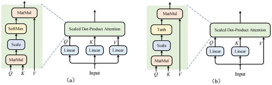 In the original self-attention, V was mapped to another vector space by the linear layer, which may have caused the information of the original space to be destroyed and the correlation among variables to be blurred, which was not conducive to the interpretation of the model. In addition, in Scaled Dot-Product Attention, SoftMax was used as the activation function, and its range was limited to (0, 1), which confused negative and weak correlations when calculating correlations among variables. To solve these problems, the linear layer on V was canceled, and we used the Tanh activation function with a range (−1, 1) instead of SoftMax. The new self-attention structure is shown in Figure 1b.