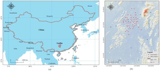 The study area is located in Guilin, China, shown geographically in Figure 3a. The research data are from online atmospheric monitoring stations in Guilin, including 10 fixed stations and 51 micromonitoring stations. The fixed stations include Dianzikeda, Luyouxueyuan, Chuangyedasha, Bazhong, Linchuan, Linkesuo, etc. The microstations include Wanfulu, Lijiangdamei, Jiangjunluxi, Xinxichanyeyuan, Shahelijiao, Hongjie, etc. Figure 3b shows the geographical distribution of these stations. The average hourly data from 2018 to 2021 for meteorological variables and pollutant concentrations were used as the basic dataset. Table 1 lists the pollutants and meteorological variables in the basic dataset. The meteorological variables include wind speed, temperature, humidity, air pressure and rainfall. The pollutant variables include PM2.5, PM10, NO2, CO, SO2 and O3. PM2.5 in the sample area was used as the prediction target for the model.