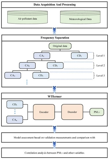 In this study, we constructed a hybrid prediction model combining wavelet transform and deep learning. The model framework is shown in Figure 5. The framework included data acquisition and processing, frequency separation, WTformer, result analysis and correlation analysis. First, hourly air pollutants and meteorological data were collected and preprocessed. Second, the low-frequency and high-frequency signals were separated from the original data by the frequency divider. Third, the WTformer model was constructed to predict future changes in PM2.5 concentration. Fourth, root mean square error (RMSE), mean absolute error (MAE) and symmetric mean absolute percentage error (SMAPE) were used as evaluation parameters. The WTformer was compared with the established baseline model and ablation model to verify the prediction performance. Finally, the correlation matrix learned by the model was analyzed to obtain the deeper time–frequency law of the meteorological and environmental variables.