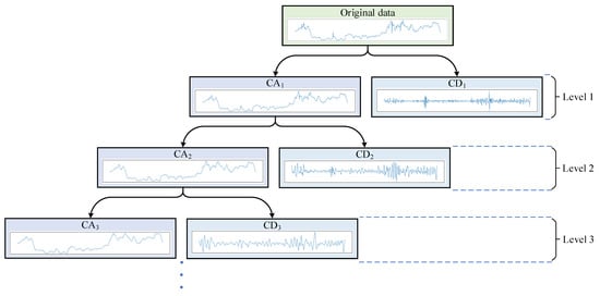 First, the original time-series data were decomposed into low-frequency component CA1 and high-frequency component CD1 by SWT. Because the decomposition process of SWT did not extract coefficients at each transform level, CA1 and CD1 had the same dimension as the original data. Then, CA1 was decomposed in the same way to obtain CA2 and CD2. The low-frequency component CAn and the high-frequency component CDn were obtained by recursive calculation, where n represents the decomposition scale. The larger the number of decomposition layers, the more detailed information was lost in the low-frequency signal. The number of decomposition layers used in this study was four.