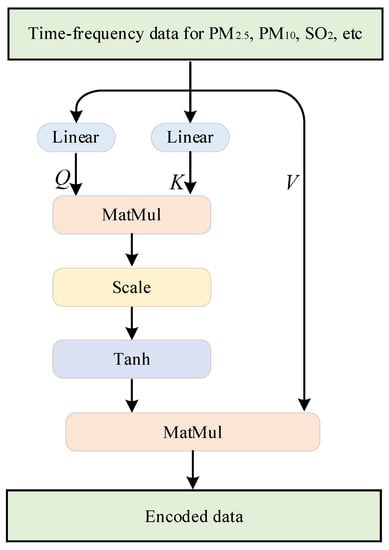 First, Q and K were obtained to map the time–frequency data of meteorology and pollutants to different spaces through the linear layer. Then, the transpose matrix of Q and K was multiplied to calculate the correlation coefficient between variables and the correlation matrix was obtained by using the Tanh activation function after normalization. Finally, the correlation matrix was multiplied by the input original data V matrix to enhance the feature information for the data. The more variables associated with PM2.5, the greater its value would be after feature enhancement, thereby enhancing the feature information for the main influencing factors and reducing the impact of interference signals.