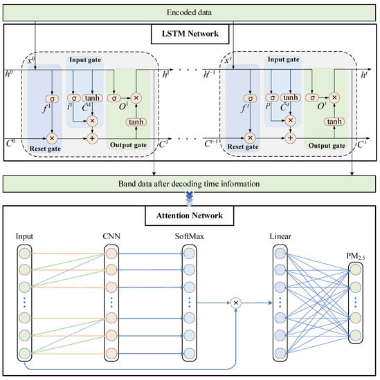 First, LSTM was used to decode time information in the time dimension to capture time dependencies. Second, the time-decoded data were input into the Attention Network, and the convolutional layer was used to extract the variable information in each frequency band and the feature bands of the correlation between PM2.5 and meteorological and pollutant parameters in different frequency bands. Third, the SoftMax layer was input to obtain the correlation matrix of each frequency domain for the prediction results. Fourth, the correlation matrix was multiplied by the data after time decoding to enhance the feature information for the main frequency bands. Finally, the PM2.5 concentration in the future was predicted by fusing the feature information with the linear layer.