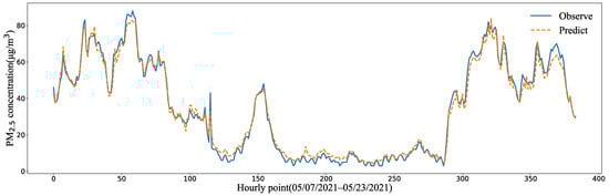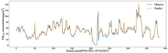 To evaluate the predictive performance of WTformer, the air pollutant concentration from January 2018 to January 2021 was used as the learning data, and the average hourly PM2.5 concentration of the two periods was used as the test data to evaluate the performance of WTformer in different situations. During the period from 7 to 23 May 2021, the change in PM2.5 concentration showed a normal trend. From 1 July to 16 July 2021, PM2.5 concentration changes frequently. Figure 9 and Figure 10 show the prediction structure of WTformer in two time periods. In different situations, the model showed good prediction performance.